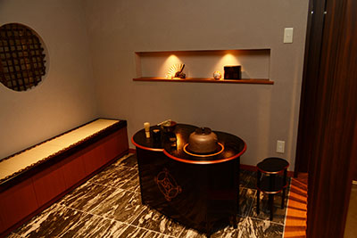 「天籟」という名は風の音から名付けられたもので、自然との調和という意味もあるそうです。天板の美しい曲線は、無限を表現する「∞」の形。また前面に施された紋は七宝文とenshuの文字を巧みに組み込んだモダンなデザインの卓です。WASPAではご来店されるお客さまにこの茶室で季節の和菓子とお抹茶でおもてなしいたします。トリートメント前にほっと一息、くつろぎのひとときをお過ごしください。