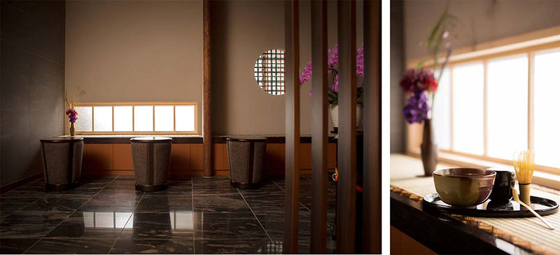 日本らしさを体験していただくために、エントランス横の「茶室」では、季節の和菓子とお抹茶をご堪能いただきながら生花や、お香でお客様をお迎えします。水は日本三大名水を使用し、日本の良きもので五感を包み込みます。