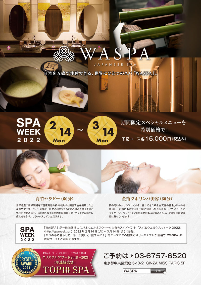 〜疲れた心とからだにリラクゼーションのひと時を〜と題して特別価格でスパ体験ができる、年に一度のスパの祭典【スパ&ウエルネスウィーク2022】が今年も開催され、WASPAが特別メニューで今年も参加します。